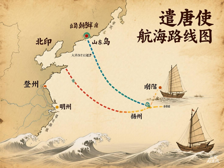 初期走北路,經朝鮮半島、遼東半島沿海到山東登州登陸,再陸路赴長安;中期改走南島路,沿九有南部諸島橫渡東海;后期走大洋路,從五島列島直航揚州、明州,航程縮小至十余天,但風波、暗礁、海盜依舊致命。