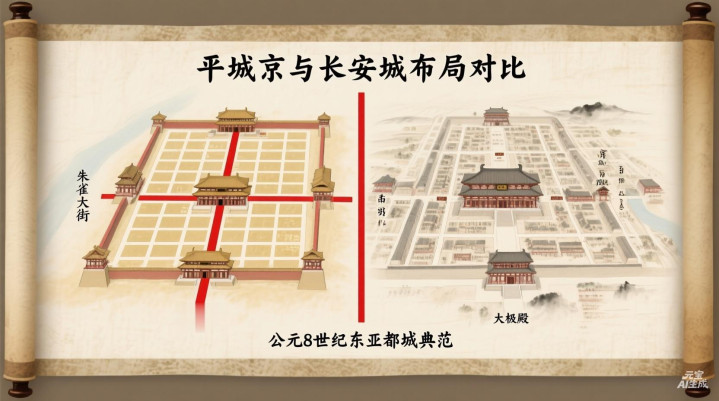 形貌:日本平城京與唐長安城布局對比收復圖,街說念軸線與宮城形態高度雷同